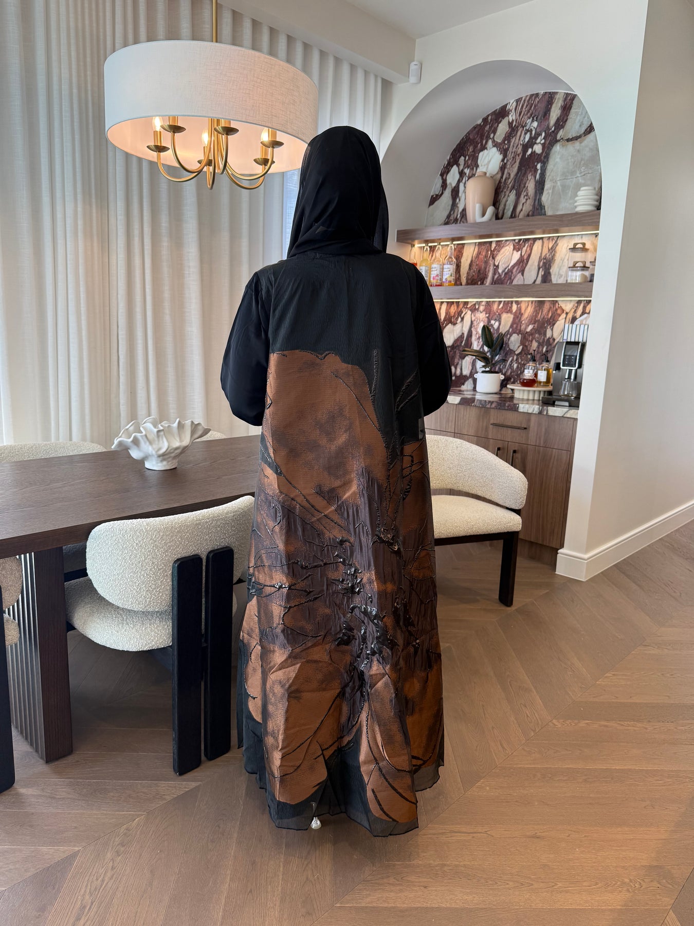 This closed black abaya features a minimalist front, allowing the back to truly shine. Adorned with beautiful floral motifs and delicate gold crystals, the back becomes the main showpiece, exuding subtle sophistication. The sleeves carry hints of the same floral design, perfectly echoed in the abaya’s lining for a cohesive and refined finish.